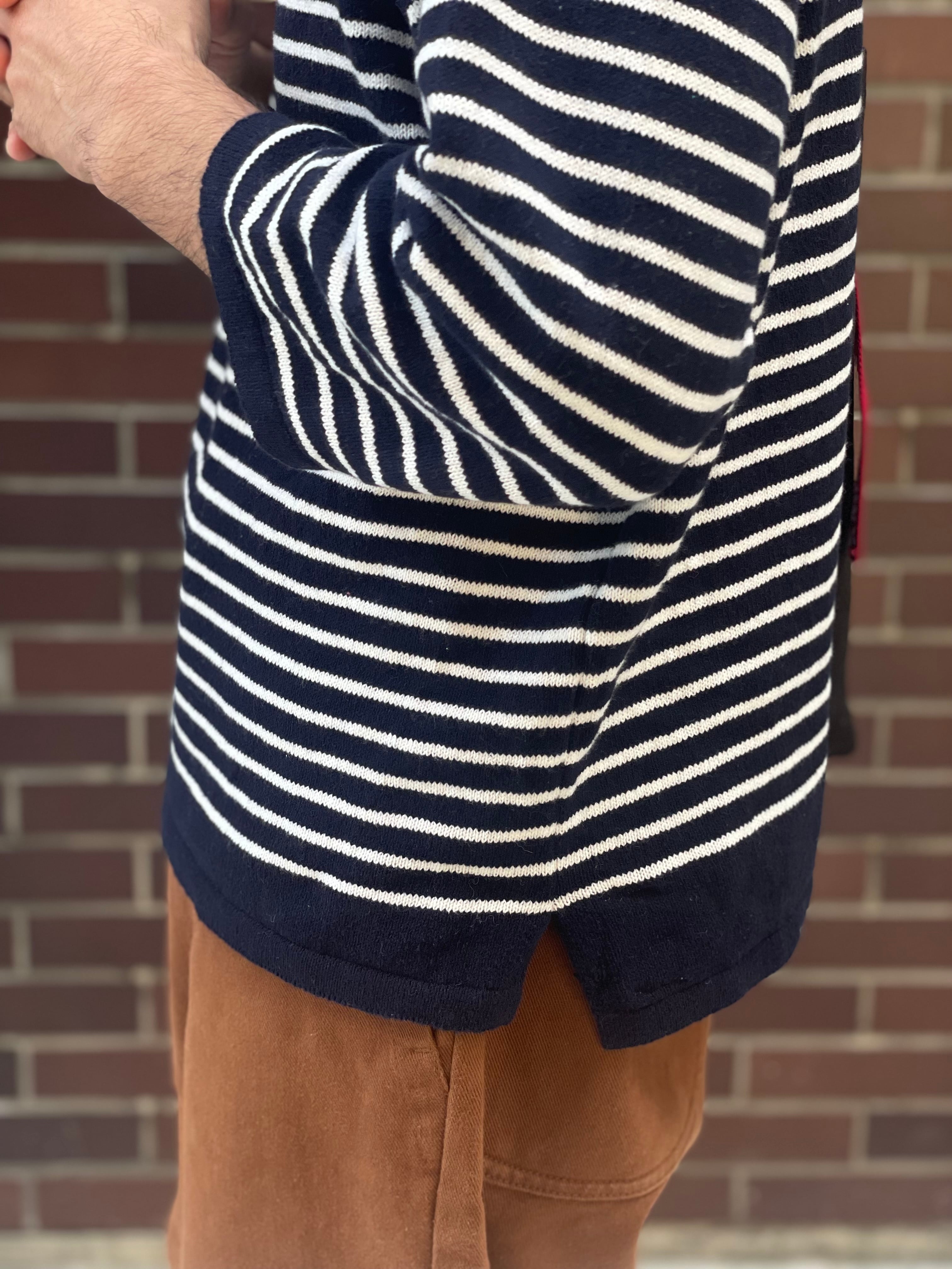 ボートネックを天竺編み折り返しリブ編みでガンジーシャツを想起させる立ち襟風ボトルネックにし、六〜七分丈に仕上げた袖や全体も成形編みで編むことで柄合わせだけで無く、裾も天竺編み折り返しで切り放し風の段差スリットと、着ることで美しいシルエットが構築されカットロスもほぼ0に。
