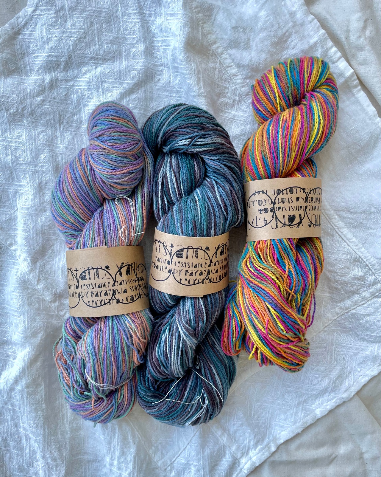 また、この ito の名前は、resisted yarn dyed をもじって Re:sistance yarn(レジスタンスヤーン)と名付けました。帯には「戦争に抗う為の毛糸」と言う意味のことばが表記されています。もう少しポジティブに言うと「ものつくりの愉しみをあじわいながら、時には立ち止まって、世界の平和について考えてみませんか」と言うsaredo からのご提案です。